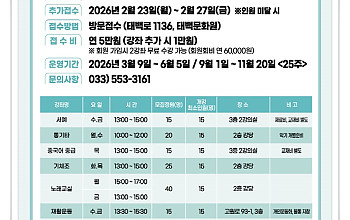 ‘태백 문화예술교육 프로젝트–Build Up’ 추진... 지역 맞춤 문화예술교육 기반 구축 및 생태계 강화 기대... 2026년 3월 13일 태백시문화재단이 강원문화재단이 추진하는 문화예술교육 지원사업에 선정되며 지역 문화예술교육 기반 강화에 나선다. (재)태백시문화재단(이사장 이상호)은 강원문화재단이 추진하는 ‘2026 기초문화재단 협력사업 스타트업 공모…