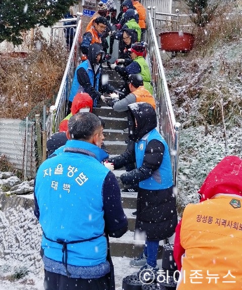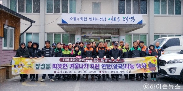 이들은 장성동 미인가 경로당 2개소(각 500장)와 저소득 가구 7세대(총 3,100장)에 연탄 3,600장과 양곡 60kg를 전달했다.