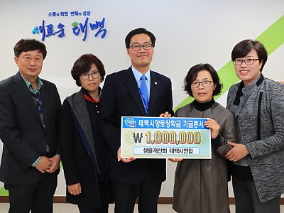 생활개선회 태백시연합(회장 황삼녀)이 지난 8일(목) 태백시청을 방문, 지역 인재 육성에 써달라며 향토장학금 100만원을 기탁하였다. ▲장학금전달 기념사진 ⓒ태백시 황삼녀 회장은 “지역 발전을 위한 인재 육성에 보탬이 되길 바라는 회원 105명의 뜻을 모아 이번 장학금을 기탁하게 되었다.”며 “앞으로도 지속적인 관심과 노력을 아끼지 않겠다.”고 밝혔다. 실…