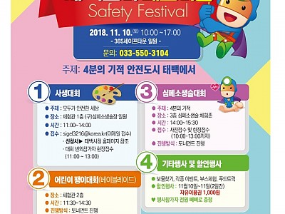 4분의 기적 ‘2018 Safety festival' 개최 태백시는 오는 11월 10일(토)과 11일(일) 이틀간 한국청소년안전체험관 일원에서 ‘2018 Safety festival'을 개최한다고 밝혔다. ▶행사 포스터 도내 유일의 안전체험관인 365세이프타운에서는 ‘4분의 기적 안전도시 태백에서’를 주제로 누구나 참여할 수 있는 안전 페스티벌을 추진한다.…
