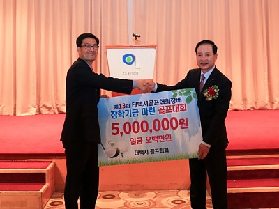 장학기금 마련을 위한 자선 골프대회 개최 2003년부터 총9,100만원 장학금 기탁 태백 골프협회(협회장 박인규)는 매년 골프협회장배 자선 골프 대회를 개최 하고 있으며 금년도 골프대회는 어제(22일)오투리조트 컨트리클럽에서 열린 가운데 오투리조트 컨벤션센타에서 시상식과 장학기금 전달식을 한 바 있다. ▶박인규 협회장이 장학금을 전달 하고 있다(사진, 태백…