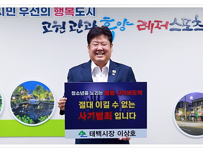 불법 사이버 도박의 위험성을 알리고, 확산을 차단하기 위해... 온라인에 익숙한 청소년들이 사이버 도박의 위험성을 인식하고 피해를 예방하기 위해... 태백시(시장 이상호)는 지난 10월 15일 태백시청 투자상담실에서 청소년 도박의 위험성을 알리기 위한‘청소년 도박 근절 릴레이 챌린지’를 진행하였다. 이번 챌린지는 청소년 대상 불법 사이버 도박의 위험성을 알…