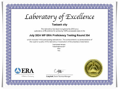 미국환경자원협회 주관, "수질 분야 시험,분석 우수 기관"으로 인증... 분석 능력의 우수성을 국제적으로 인정받아... 태백시(시장 이상호)는‘태백시 공공하수처리시설 실험실’이 미국환경자원협회(ERA)가 주관하는 국제숙련도 평가에 참가해 작년에 이어 올해에도 수질 분야 시험·분석‘우수기관(Laboratory of Excellence)’으로 인증받았다고 밝혔…