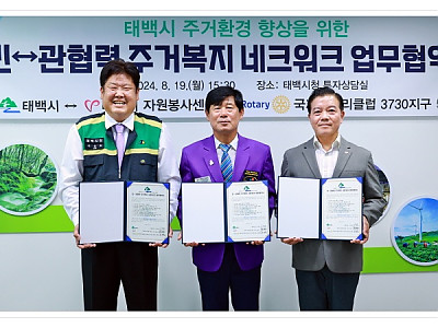 복지 사각지대에 놓인 주거 취약계층에 다양한 주거 안정 및 지원을 추진... 제도적으로 지원받을 수 없는 사각지대가 증가, 민ㆍ관의 협력이 더욱 중요해져... 태백시(시장 이상호)는 8월 19일 태백시청 투자상담실에서 태백시자원봉사센터, 국제로타리클럽 3730지구 5지역과 태백시 주거환경 향상을 위한 ‘민↔관 협력 주거복지 네트워크 업무협약’을 체결하였다고…