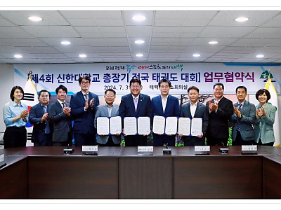 태백시-신한대-강원특별자치도태권도협회-태백시 태권도 협회, 업무 협약... 2029년까지 5년간 신한대학교 총장기 전국 태권도 대회를 개최하기로 합의... 태백시(시장 이상호)는 지난 7월 31일 태백시청 소회의실에서 신한대와 강원특별자치도태권도협회, 태백시태권도협회와 함께 ‘제4회 신한대학교 총장기 전국 태권도 대회’개최를 위한 업무협약을 체결했다. 이날…