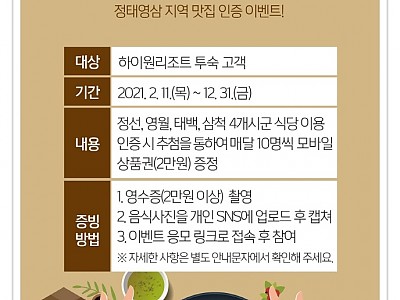 투숙객 대상 맛집 방문 인증 이벤트 실시... 매당 10명 추첨을 통해 선발, 모바일 상품권 2만원 지급... 하이원리조트(대표 문태곤)가 코로나19로 침체된 강원 폐광지역의 소비 촉진을 유도하고 지역 경제 활성화를 위해 ‘2021 정·태·영·삼 맛집 방문 인증 이벤트’를 오는 11일부터 12월 31일 까지 진행한다고 8일 밝혔다. 이번 정태영삼 맛집 방문…