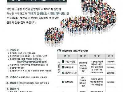 국민 소통과 참여 증진을 위해... 제2기 시민참여혁신단, 내달 19일까지 모집... 강원랜드(대표 문태곤)가 국민의 의견을 수렴해 사회적 가치 실현과 효율적인 경영 혁신을 실천하기 위한 ‘제2기 시민참여혁신단’을 23일부터 내달 19일까지 모집한다. 시민참여혁신단은 지역경제공헌·일자리창출·사회적 약자 지원 관련 사업에 대한 의견 제공, 미래방향 설정과 혁…