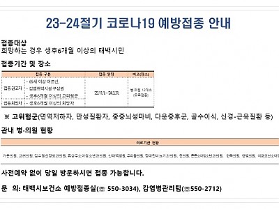 접종 권고 및 희망자는 이달부터 가까운 병,의원에서 가능... 일상 회복을 지속하기 위해 시민들의 높은 참여가 중요... 태백시(시장 이상호)는 겨울철 코로나19 감염으로 인한 중증 및 사망 예방을 위해 코로나19 예방접종을 내년 3월 31일까지 무료로 접종한다고 밝혔다. 고위험군의 적극 접종 권고 대상자는 65세 이상 어르신, 감염취약시설 구성원, 6개월…