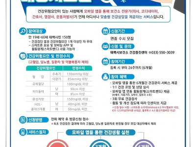 어르신들께 스마트폰을 활용한 비대면 건강관리 서비스 제공... 취약계층 독거 어르신 120명, 일반시민을 대상 50명 선착순 추가 모집... 태백시(시장 이상호)는 방문 건강관리 서비스의 한계를 극복하고 의료 접근성이 떨어지는 어르신들께 스마트폰을 활용한 비대면 건강관리 서비스를 제공하는 AI‧IOT기반 어르신 건강관리 사업을 실시한다. 이에 시는 오는 7…