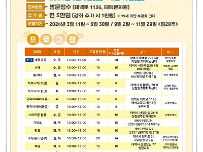 리모델링 공사로 강좌는 외부에서 실시... 바둑, 해금, 가야금, 사물놀이 등 총 15개 강좌... 태백문화원(원장 최명식)이 2024년 태백문화원 문화강좌 수강신청을 5일부터 오는 16일까지 접수받는다. 신규 개설된 재활운동을 포함 서예, 통기타, 하모니카(초급,중급), 중국어회화(초급,중급), 스마트폰활용, 기체조, 민요, 바둑, 해금, 가야금, 사물놀…