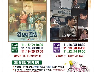 "우리끼리 수요시네마"는 생활권이 같은 직장, 학교, 모임 등... 온라인 예매가 어려울 경우 사무실에서도 예매 가능, 탄탄페이도 가능... 태백시(시장 이상호)는 태백문화예술회관(태백시네마)에서는 5년 만에 돌아온 주윤발의 신작으로기대를 모으고 있는 『원모어찬스』 와 실제로 1999년 전라북도 완주군에서 발생했던 '삼례 나라슈퍼 강도치사 사건'을 바탕으로…