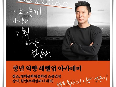 노는게 아니라 기확하는 겁니다. 지역에서 생존하는 열혈 청년 기획자의 생존기를 전할 예정... 태백시(시장 이상호)는 오는 12일 오후 7시 문화예술회관 소공연장에서 두번째 청년 역량 레벨업 아카데미를 개최한다. 이날 아카데미에는 ‘노는게 아니라 기획하는 겁니다’ 라는 주제로 원민 우깨컴퍼니 대표가 초청되어, 지역에서 생존하는 열혈 청년 기획자의 생존기를 …