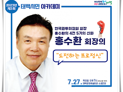 "4전 5기의 신화 홍수환 회장의 도전하는 프로정신" 강의... 태백시민이라면 누구나 무료로 참여... 태백시(시장 이상호)는 오는 27일 오후 7시 문화예술회관 소공연장에서 제3회 태백시민 아카데미를 개최한다. 이날 아카데미에는 ‘4전 5기의 신화 홍수환 회장의 도전하는 프로정신’라는 주제로 홍수환 한국권투위원회 회장이 초청되어 인생의 위기에 도전할 수 …