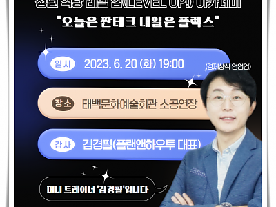 오늘은 짠테크 내일은 플렉스 !!... "아끼면 아낄수록", 행복한 재테크 성공의 기본기 방법에 대한 노하우 전해... 태백시(시장 이상호)는 오는 20일 오후 7시 문화예술회관 소공연장에서 청년 역량 레벨업 아카데미를 개최한다. 이날 아카데미에는 ‘오늘은 짠테크 내일은 플렉스’ 라는 주제로 김경필 플랜앤하우투 대표가 초청되어, ‘쓰면 쓸수록’이 아닌, ‘…