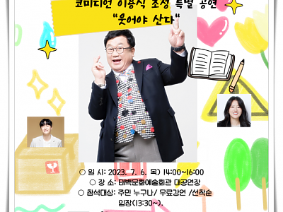 태백시민이면 누구나 무료로 참여... "웃어야 오래 산다"라는 주제로 웃음의 비법에 대한 이야기를 전할 예정... 태백시(시장 이상호)는 오는 7월 6일 오후 2시 문화예술회관 대공연장에서 코미디언 이용식 초청 특별 공연을 개최한다. 이날 공연에는 ‘웃어야 오래 산다’라는 주제로 코미디언 이용식이 초청되어 웃음의 비법에 대한 이야기를 감동과 함께 전할 예정…