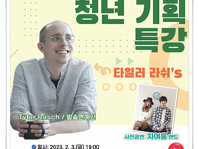 청년이 자신만의 꿈을 실현하고 자립할 수 있었으면... 지역 청년들의 권익증진과 발전을 위해... 태백시(시장 이상호)는 오는 2월 3일 오후 7시 문화예술회관 대공연장에서 태백시 청년들을 위한 청년 기획 특강을 개최한다고 밝혔다. 이번 청년특강에는 타일러 라쉬를 초청해 ‘원하는 대로 살고 싶다면 박스를 탈출하라’라는 주제로 청년의 꿈과 다양성에 대한 강의…