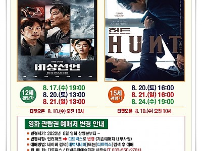 탄탄페이로 영화 두편을... "우리끼리 수요시네마", 오는 17일과 24일 희망하는 단체 신청 가능... 태백문화예술회관은 8월 영화로 ‘비상선언’과 ‘헌트’를 각각 상영한다. 영화 ‘비상선언’은 개봉 첫날 박스 오피스 1위를 차지한 영화이며 사상 초유의 항공 테러로 무조건적 착륙을 선포한 비행기와 재난에 맞서는 사람들의 이야기를 그린 항공 재난 액션영화로…