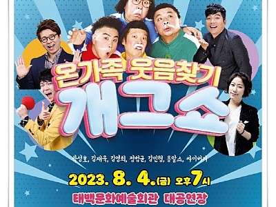 온 가족이 즐길 수 있는 개그 콘서트형 공연, 100분간 진행... 개그, 노래, 춤 등 다양한 볼거리로 즐거움을 선사할 예정... 태백시(시장 이상호)는 문화예술회관 8월 기획공연『온가족 웃음찾기 개그쇼』가 오는 8월 4일 금요일 오후 7시 태백문화예술회관 대공연장에서 개최된다고 밝혔다. 이번 공연은 태백의 대표 축제인 한강·낙동강 발원지 축제 ‘2023…