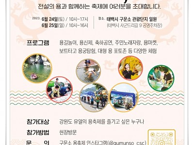 24일부터 25일 양일간 구문소 관광단지 일원에서 개최... 강원특별자치도에서 유일하게 열리는 전통문화를 보존하고... 올해 10회를 맞는 구문소 용 축제가 오는 24일부터 25일까지 이틀간 고생대자연사박물관 앞 구문소관광단지 일원에서 개최된다. ‘구문소 용 축제’는 강원특별자치도에서 유일하게 열리는 전통문화를 보존하고 마을의 화합과 번영을 기원하는 명물 …