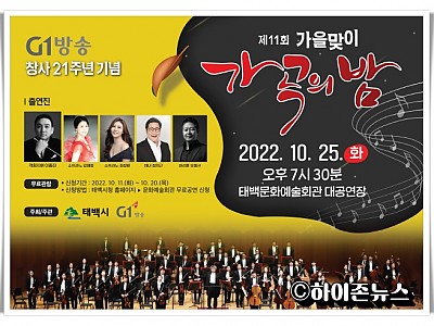 G1방송 창사 21주년 기념, "제 11회 가을맞이 가곡의 밤" 개최... 클래식 명곡들로 가득 채운 고품격 음악회로 태백시민을 만나며... 태백시(시장 이상호)는 오는 25일 오후 7시 30분 태백문화예술회관 대공연장에서 G1방송과 함께 ‘제11회 가을맞이 가곡의 밤’ 무료공연을 개최한다. 이번 공연은 강원도 대표방송 G1방송 창사 21주년을 기념하여 태…