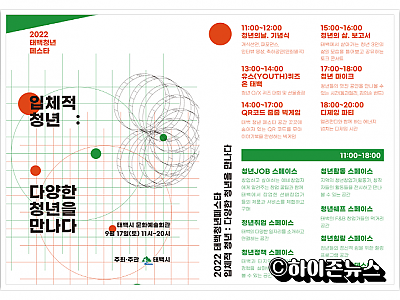 오는 17일 청년의 날, 태백문화예술회관 일대에서 개최... 청년 중심의 자발적 참여형 축제를 통해 공감의 장 마련... 태백시(시장 이상호)는 오는 17일 청년을 날을 맞이해 태백문화예술회관 일대에서 ‘2022 태백 청년 페스타’를 개최한다. ‘입체적 청년, 다양한 청년을 만나다’라는 주제로 진행되는 이번 행사는 청년 세대의 혁신 에너지를 높이고 청년 중…