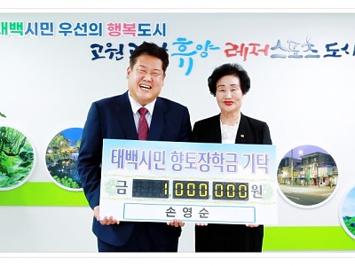 전몰군경미망인 손영순씨, 장학금 기탁... 다양한 나눔 활동을 행하며 내리 사랑을 몸소 실천... 전몰군경미망인 태백시지회장 손영순씨가 지난 27일 태백시청을 방문하여 장학금으로 100만 원을 기탁했다. 이날 장학금은 강원보훈대상을 수상하여 받은 시상금을 장학금으로 마련한 것으로 기탁의 의미를 더했다. 선명장수경로당 회장도 맡고 있는 손영순씨는 경로당 어르…