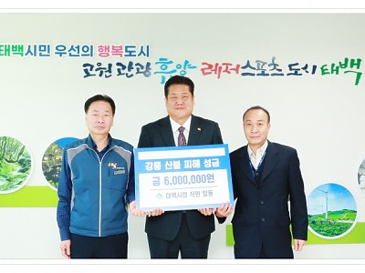 시청 직원들이 자발적으로 기부한 성금 기탁... 이재민의 어려움을 함께하는 마음으로 지역민들이 일상회복에 도움이 되길... 지난 19일 태백시(시장 이상호)는 산불로 피해를 입은 강릉 지역을 위해 태백시청 직원들이 자발적으로 기부한 성금 600만 원을 강원도 사회복지공동모금회에 전달했다. 이상호 태백시장은 “갑작스러운 산불 피해로 실의에 빠진 강릉 지역 이…