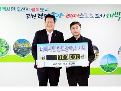 지역 인재 육성을 위해 장학금 기탁... 지역 발전에 조금이나마 기여할 수 있어서 감사함을 느껴... 극단 “산” (대표 윤정환)은 지난 14일 지역 인재육성 장학금 기탁을 위해 태백시청을 방문해 장학금 100만 원을 전달했다. 윤정환 대표는 극단 “산” 대표이자 현재는 정선 ‘아리 아라리’ 공연 작가와 연출을 맡고 있다. 정선아리랑을 소재로 한 창작 뮤지…