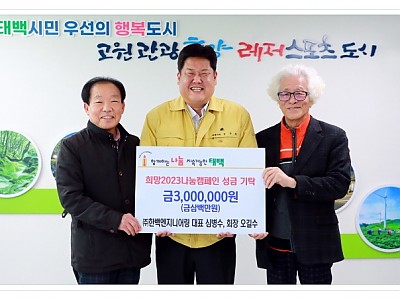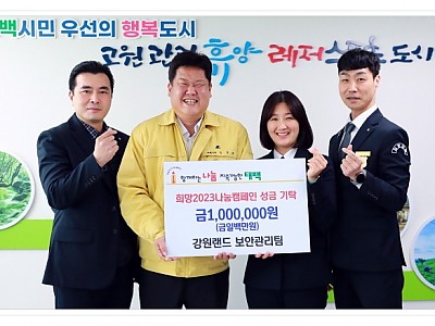 희망 2023 나눔 캠페인 이웃돕기 성금 기탁... 저소득 가정과 복지사각지대 대상자를 위해... 강원랜드(대표이사 이삼걸) 보안관리팀에서는 지난 28일 태백시청을 방문해 희망2023 나눔 캠페인 이웃 돕기 성금으로 100만 원을 관내 저소득층을 위해 써달라며 지정 기탁 하였다. 이날 기탁식에 참석한 김종묵 팀장과 김희수, 정성훈 과장 등 3명은 “평소에도…
