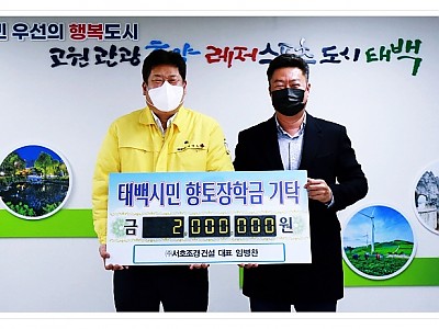 2019년 부터 꾸준히, 교육발전을 위한 장학금 기탁... 우리 사회의 훌륭한 인재로 성장하는데 도움이 되길... ㈜서호조경(대표 임병찬)은 지난 15일 태백시청을 방문하여 태백시 교육발전을 위한 장학금 200만원을 전달했다. ㈜서호조경은 공원 조성, 조경 시공 및 유지 관리의 종합 조경업체로 지난 2019년부터 꾸준히 지역인재 양성장학금을 전달해 오고 있…