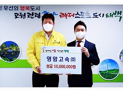 태백 영암운수, 희망2023 나눔캠페인 이웃돕기 성금 기탁... 어려운 복지사각지대 가정이 연말을 따뜻하게 보낼 수 있도록... 태백 영암고속(주)(회장 박학도)는 지난 16일 태백시청을 방문해 지역의 어려운 이웃을 위해 써 달라며 희망2023나눔캠페인 이웃돕기 성금 1,000만 원을 기탁했다. 박학도 회장은 “생활이 어려운 복지사각지대 가정이 연말을 맞아…