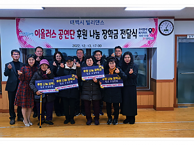 관내 저소득층 청소년을 위해 장학금 기탁... 이올러스는 매년 공연 수익금을 어려운 이웃에게 마음을 전달... 밸리댄스 공연단 ‘태백 이올러스’(단장 신선향)는 지난 13일 황지동 행정복지센터를 방문하여 관내 저소득층 청소년을 위해 써달라며 장학금 250만원을 전달했다. 민․관 협력사업으로 진행된 이번 후원금은 지난 3일 문화예술회관에서 시민들을 대상으로 …