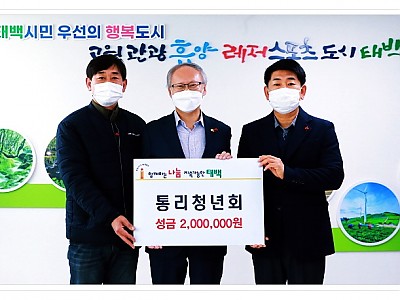 어려운 이웃을 돕기 위해 성금 기탁... 저소득 가정에 조금이나마 보탬이 되었으면... 태백시 통리청년회(회장 김동균)은 5일 태백시청을 방문해 어려운 이웃을 위해 써 달라며 이웃돕기 성금 200만원을 기탁했다. 김동균 회장은 “어렵게 생활해 나가는 독거노인, 장애인, 한부모가정 등 저소득층 가정이 많은데 이들 가정에 조금이라도 보탬이 되었으면 좋겠다”는 …