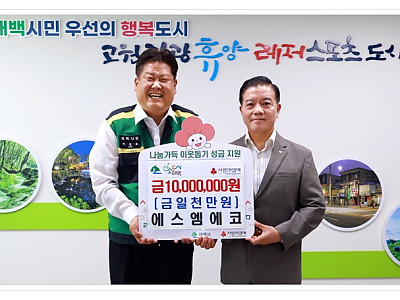 관내 어려운 환경에 놓인 우리 이웃들에게 따뜻한 마음이 전달되길... 향토장학금과 이웃돕기 성금 등 꾸준한 사회에 봉사하는 마음으로... 사회적기업 에스엠에코(대표 권순주)는 지난 8월 22일 태백시청에 관내 저소득층을 위해 사용해달라며 성금 1,000만 원을 기탁하였다. 권순주 대표는“관내 어려운 환경과 사각지대에 놓인 우리 이웃들에게 따뜻한 마음이 전달…
