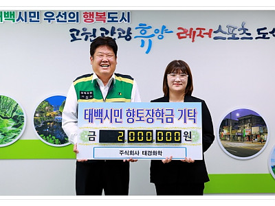 미래인재 육성을 위한 장학금 기탁... 앞으로도 온기를 나누는 기업이 되도록... ㈜태경화학(대표 임환희)는 지난 8월 20일 태백시에 미래인재 육성을 위한 장학금 200만 원을 기탁하였다. 임대표는“기탁한 장학금이 작지만 큰도움이 되길 바라고 학생들의 꿈을 응원한다. 앞으로도 꾸준히 나눔의 온기를 전하는 기업이 되도록 힘쓰겠다“고 기탁의 뜻을 밝혔다. 향…