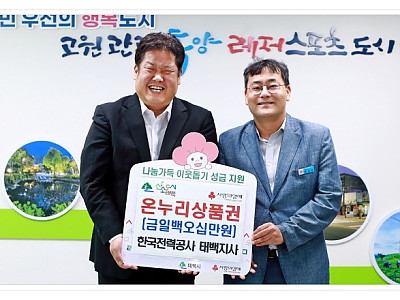관내 1인 독거노인가구를 위한 온누리상품권 후원... 한국전력공사 태백지사 직원들의 자발적인 모금으로 후원... 한국전력공사 태백지사(지사장 배상린)는 지난 7월 10일 태백시에 1인 독거노인가구를 위한 온누리상품권 150만 원을 후원하였다. 배상린 지사장은“한국전력공사 태백지사 직원들의 자발적인 모금으로 후원을 하게 되었다. 관내 어르신들을 위해 따뜻하게…