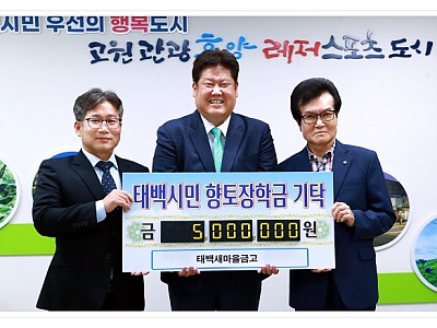 지역인재 육성을 위해 장학금 기탁... 앞으로도 지역을 위한 환원에 힘을 모아... 태백시새마을금고(이사장 김석수)는 지난 6월 7일 태백시에 지역인재 육성을 위한 장학금 500만 원을 기탁하였다. 김석수 이사장은 “태백새마을금고가 지역과 함께 성장하고 있는 만큼, 지역에 보탬이 되고자 장학금을 기탁하게 되었다. 앞으로도 지역을 위한 환원에 힘쓰겠다”고 전…