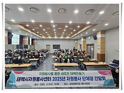 봉사단체 간 소통 및 협력 강화... 지속 가능한 봉사활동 방향 모색... 태백시자원봉사센터(소장 권순주)는 지난 3월 5일 상장문화의집 대강당에서 지역 내 봉사단체장 40명이 참석한 가운데 ‘단체장 간담회 및 리더워크숍’을 개최했다. 이번 간담회는 봉사단체 간 소통과 협력을 강화하고 지속 가능한 봉사활동 방향을 모색하기 위해 마련됐다. 참석자들은 봉사활동…