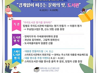 4월 한 달 다양한 독서문화 행사를 운영... "우리 도서관 향기를 찾아라!", 특강 등 다양한 행사를 진행... 태백시립도서관과 산소드림도서관에서는 오는 도서관의 날과 도서관 주간을 맞아 4월 한 달 다양한 독서문화 행사를 운영한다. 도서관의 날(4. 12.)과 도서관 주간(4.12.~4.18.)은 도서관의 가치와 필요성을 홍보하고 지역주민들의 도서관 이…