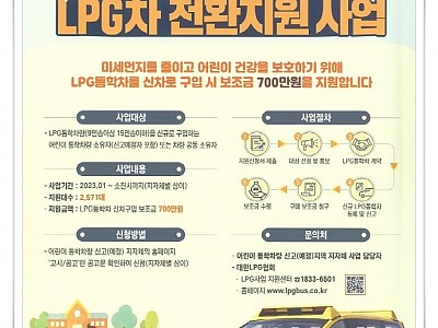 어린이 건강보호와 미세먼지 저감을 위해... 1대당 700만원씩 정액 지원하고 지원 물량은 총 3대... 태백시(시장 이상호)는 어린이 건강보호와 미세먼지 저감을 통한 대기환경 개선사업의 일원으로 오는 27일부터 예산 소진 시까지 2023년 어린이 통학차량 LPG전환 지원사업에 대한 신청을 받는다. 사업 신청 대상은 경유차를 폐차하고 어린이 통학차량(9~1…