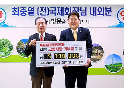 순직산업전사위령탑을 차맵한 뒤 따뜻한 마음을 담아... 라이온스협회의 봉사정신을 이어받아 더 살기 좋은 도시를 만들기 위해 최선을... 태백시(시장 이상호)는 지난 28일, 국제라이온스협회 제103대 전 국제회장인 최중열 회장이 태백시를 방문해 고향사랑기부금 500만 원을 기탁했다고 밝혔다. 이번 방문은 평소 태백시와 라이온스협회에 대한 각별한 관심과 지원…