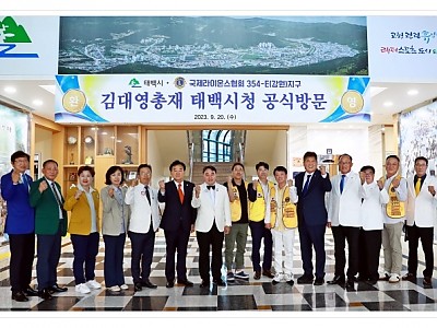 기부금이 태백 발전에 작은 도움이 되었으면... 국제라이온스협회 354-E 지구와 제 6지역 임원들과 간담회를 가져... 국제라이온스협회 354-E(강원)지구 김대영 총재는 20일 태백시청을 방문해 고향사랑기부금을 기탁했다. 김대영 총재는 “기부금이 태백 발전에 작은 도움이 되었으면 한다”라며, “국제라이온스협회 활동에 많은 관심과 격려를 부탁드린다”고 말…