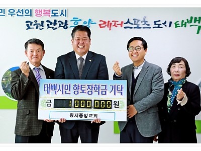 올해도 인재육성을 위한 장학금 기탁... 지역과 이웃에 관심을 가지고 도움의 손길을 실천... 태백시(시장 이상호)는 지난 15일 황지중앙교회(목사 정현석)에서 지난해에 이어 올해도 인재육성을 위한 장학금 100만 원을 기탁했다고 전했다. 정현석 담임목사는 “우리 교회가 지역과 이웃에 관심을 가지고 도움의 손길을 내미는 것이야말로 사랑의 실천이라고 생각한다…