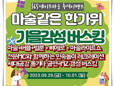 가족단위 방문객들이 즐길 수 있는 행사가 열려... 어린이, 청소년들이 안전체험과 더불어 가족과 함께하는 문화행사를 가져... 태백시(시장 이상호)는 올해 임시공휴일을 포함 총 6일을 쉴 수 있는 연휴기간 365세이프타운에서 가족단위 방문객들이 즐길 수 있는 행사가 열린다고 전했다. 추석을 맞아 365세이프타운에서는 9월 29일부터 10월 1일까지 3일간 …