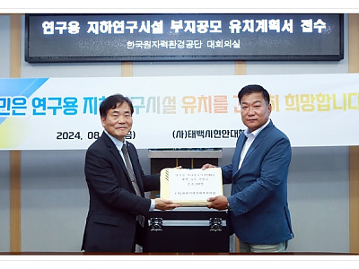 현안대책위원회, "연구용 지하연구시설 유치 염원 태백시민 서명부" 전달... 폐광으로 침체된 지역 경제 활성화 및 일자리를 창출 기대... 태백시(시장 이상호)는 8월 2일 한국원자력환경공단(경상북도 경주시)에 산업통상자원부와 한국원자력환경공단이 공동으로 진행하는 ‘연구용 지하연구시설(URL) 부지공모’에 따른 유치계획서를 제출했다. 이번 유치계획서는 지난…