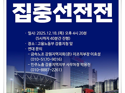 직장 내 괴롭힘·차별 고발 두 달째 결론 없어…노동자들 강릉지청 앞 선전전 지속... 금속노조 “회사 소극 대응과 노동부 무책임이 문제 키웠다”…집중선전전으로 지역사회 알려... ㈜롯데칠성음료 강릉공장에서 일하는 무기계약직 여성노동자들이 직장 내 괴롭힘과 임금 등 각종 차별 문제를 고발한 지 두 달이 다 되어가지만, 고용노동부는 아직까지 아무런 결론을 내놓…