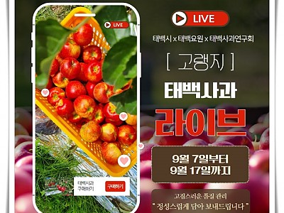 평균해발고도 900m 고랭지사과 라이브커머스 진행... 이번에 판매되는 "태백아리수", "태백홍로" 상품성이 뛰어난 것으로 평가... 태백시(시장 이상호)에서는 평균해발고도 900m 고원지대에서 재배되는 고랭지 사과인 태백사과 천상애 브랜드 마케팅을 위해 추석맞이 라이브 커머스를 추진한다고 밝혔다. 이번에 판매되는 ‘태백아리수’와 ‘태백홍로’는 높은 해발고…