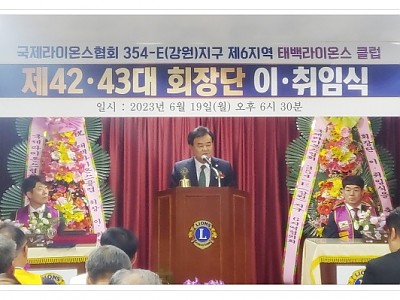 제 43대 이도훈 회장에게 클럽기가 전수.. 우리 사회의 그늘지고 소외된 곳에 참된 사랑과 나눔을 실천... 태백시의회(의장 고재창)는 19일 태백라이온스클럽 회관에서 열리는 태백라이온스클럽 회장 이·취임식에 참석했다. 이날 행사에서는 이임하는 신성일 회장에게 회원들이 감사한 마음을 담은 공로패가 전해졌으며, 제43대 회장으로 취임된 이도훈 회장에게는 취임…