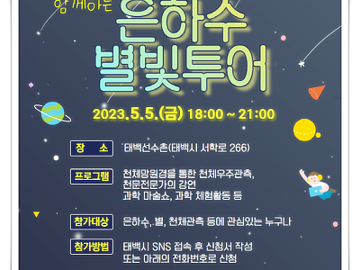 2023 은하수 별빛투어 추진... 과학 마술쇼, 과학 체험 등 다양한 활동이 준빈되어 있어... 태백시(시장 이상호)가 평균 해발고도 900m, 고원도시 태백의 은하수 도시 브랜딩을 강화하기 위해 오는 5월 5일 전문가와 함께하는 은하수 별빛투어 행사를 추진한다. 행사는 어린이 날인 5월 5일 저녁 6시부터 9시까지 1330m 고지대에 위치한 태백선수촌에…