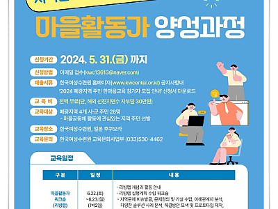지속적 사업으로 폐광지역 주민 활동가 네트워크 플랫폼 역활 톡톡... 태백, 삼척, 영월, 정선 4개 지역 주민이면 누가나 참여 가능... (재)한국여성수련원(원장 함영이)이 오는 5월 31일(금)까지 태백시, 삼척시, 영월군, 정선군 주민을 대상으로 ‘2024 폐광지역 주민 한마음교육’ 참가자 총 28명을 모집한다. 이번 ‘폐광지역 주민 한마음 교육’은 …